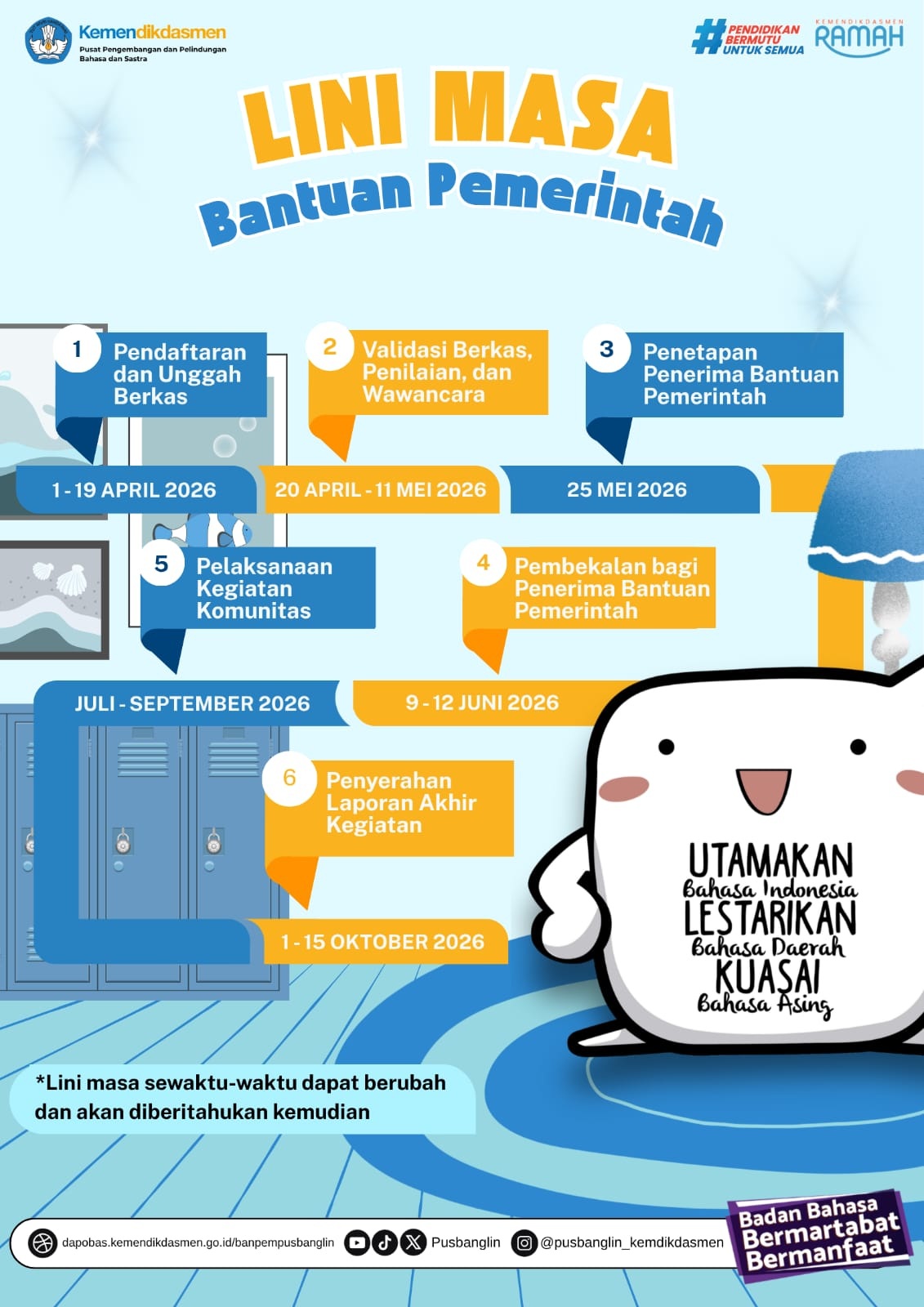 Penyaluran Bantuan Pemerintah Bidang Kebahasaan dan Kesastraan Tahun 2026redaksi-bba01/04/2026 Badan Pengembangan dan Pembinaan Bahasa, Kementerian Pendidikan Dasar dan Menengah...Baca selengkapnya