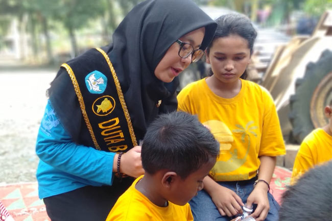 Bersama Duta Bahasa anak-anak Sopo Safari belajar membuat kerajinan tangan dari barang bekas. Bahan baku barang bekas banyak ditemukan dinsekitaran TPA. Anak-anak terlihat antusias mengikuti kegiatan ini. “Sampah jika dikelola dengan kreativitas tinggi akan mempunyai nilai tambah,” tukas Nadia.