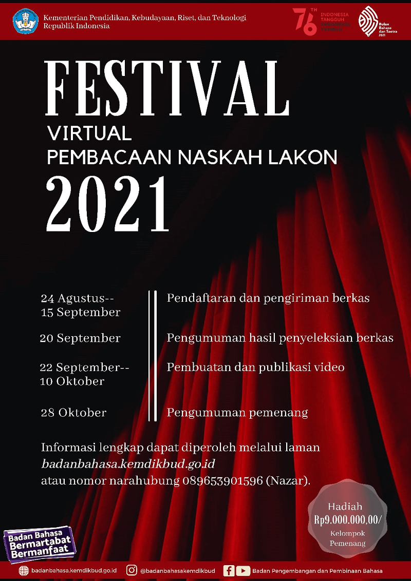 Dalam rangka Bulan Bahasa dan Sastra 2021, Badan Pengembangan dan Pembinaan Bahasa melalui Pusat Pembinaan Bahasa dan Sastra menyelenggarakan kegiatan Festival Virtual Pembacaan Naskah Lakon.