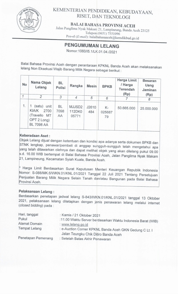 Pengumuman Lelangby redaksi-bbain Artikelon Posted on 15/10/202118/10/2021 Pengumuman Lelang Roda Dua Lelang Kendaraan Roda Empat Related