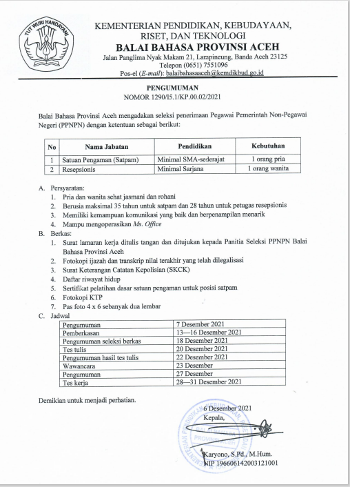 Pengumuman PPNPNby redaksi-bbain Artikelon Posted on 07/12/202117/12/2021 Berikut ini adalah pengumuman perekrutan PPNPN Desember 2021. Pengumuman-PPNPNUnduh Related