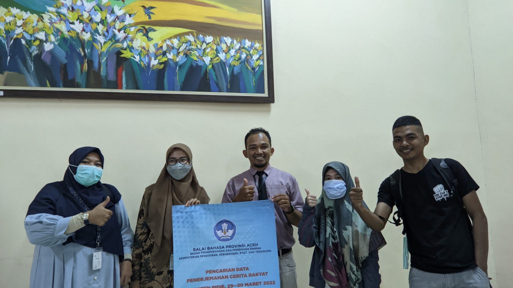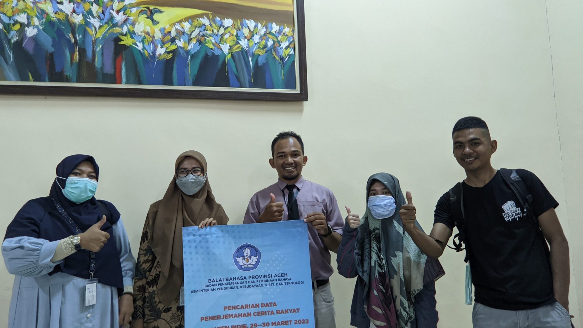 Pada 29—30 Maret 2022, Tim Pencarian Data Penerjemahan Cerita Rakyat berkunjung ke Kabupaten Pidie untuk bertemu narasumber cerita rakyat berbahasa daerah di Ruang Rapat Sekolah Sukma Bangsa Pidie di Peukan Baro. Sasaran cerita rakyat yang dicari adalah cerita rakyat berbahasa Aceh.
