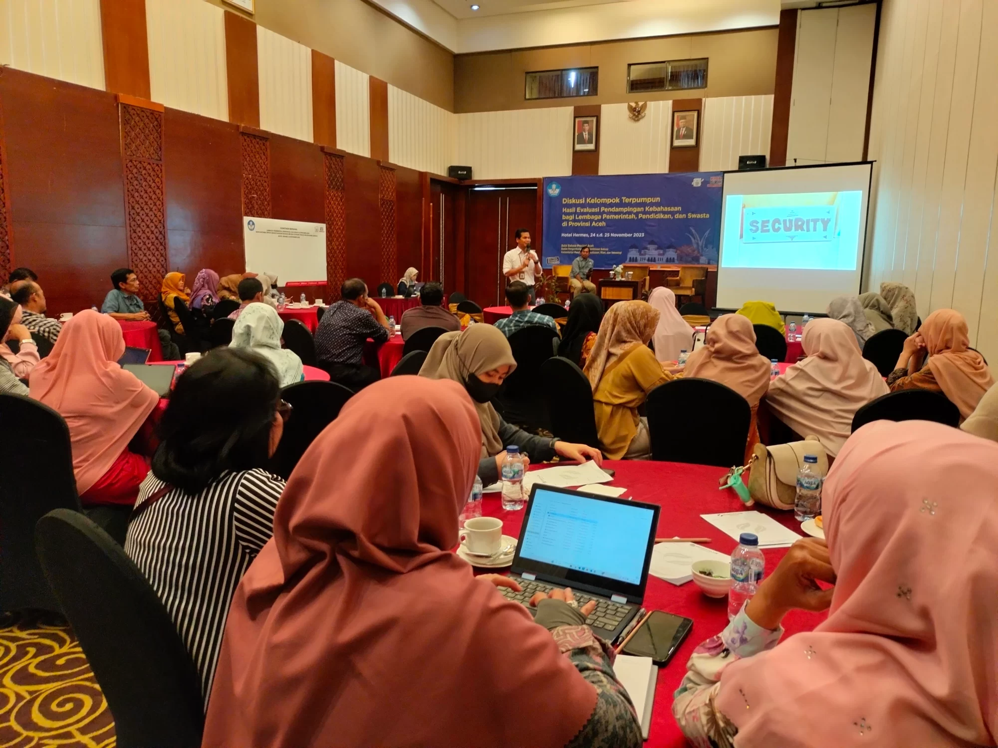 Balai Bahasa Provinsi Aceh, melalui KKLP Pembinaan Bahasa dan Hukum, telah melaksanakan Diskusi Kelompok Terpumpun (DKT) Hasil Evaluasi Pendampingan Kebahasaan bagi Lembaga Pemerintah, Pendidikan, dan Swasta di Provinsi Aceh. Kegiatan dilaksanakan selama dua hari, 24—25 November 2023, di Hotel Hermes Palace, Banda Aceh. Peserta kegiatan berjumlah 45 orang yang mewakili 45 lembaga pemerintah, pendidikan, dan swasta di Aceh. Narasumber kegiatan terdiri dari perwakilan Biro Ortala Sekda Aceh, Bapak Syafrizal, S.P., M.Si.; Kabag Organisasi Sekdako Banda Aceh, Bapak Hafriza, S.STP., M.A.; serta tim KKLP Pembahu Balai Bahasa Provinsi Aceh: Bapak Safrizal, S.Pd., Sabrun Jamil Tanjung, S.S., dan Adnan Anggita Nasution, S.S.