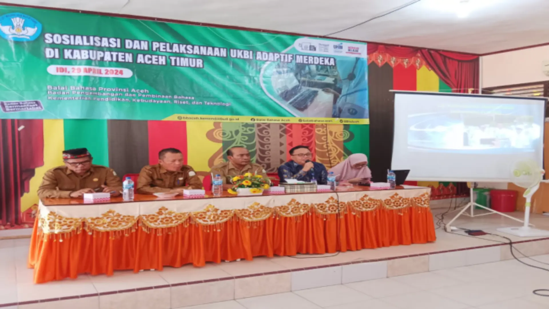 Kepala Balai Bahasa Provinsi Aceh didampingi tim UKBI melakukan Sosialisasi dan Pelaksanaan UKBI Adaptif Merdeka di Kabupaten Aceh Timur kepada 50 peserta yang terdiri atas, pengawas, kepala sekolah, dan guru di lingkungan Dinas Pendidikan dan Kebudayaan Kabupaten Aceh Timur. Kegiatan dilaksanakan di aula dan laboratorium komputer SMP Negeri 1 Idi.