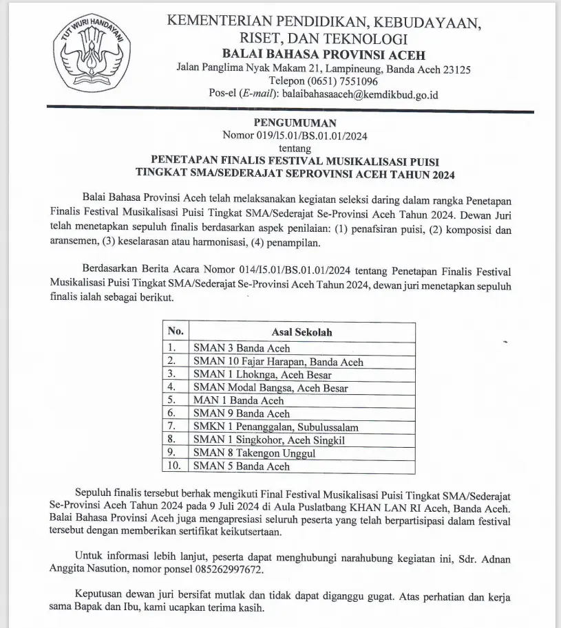 Balai Bahasa Provinsi Aceh telah melaksanakan kegiatan seleksi daring dalam rangka Penetapan Finalis Festival Musikalisasi Puisi Tingkat SMA/Sederajat Se-Provinsi Aceh Tahun 2024. Dewan Juri telah menetapkan sepuluh finalis berdasarkan aspek penilaian: (1) penafsiran puisi, (2) komposisi dan aransemen, (3) keselarasan atau harmonisasi, (4) penampilan.