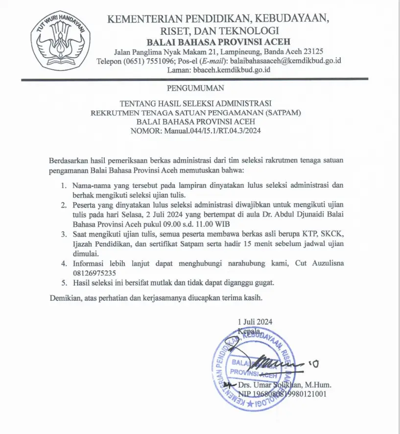 Asalamualaikum Rakan. Berikut adalah hasil seleksi administrasi rekrutmen tenaga satuan pengamanan Balai Bahasa Provinsi Aceh