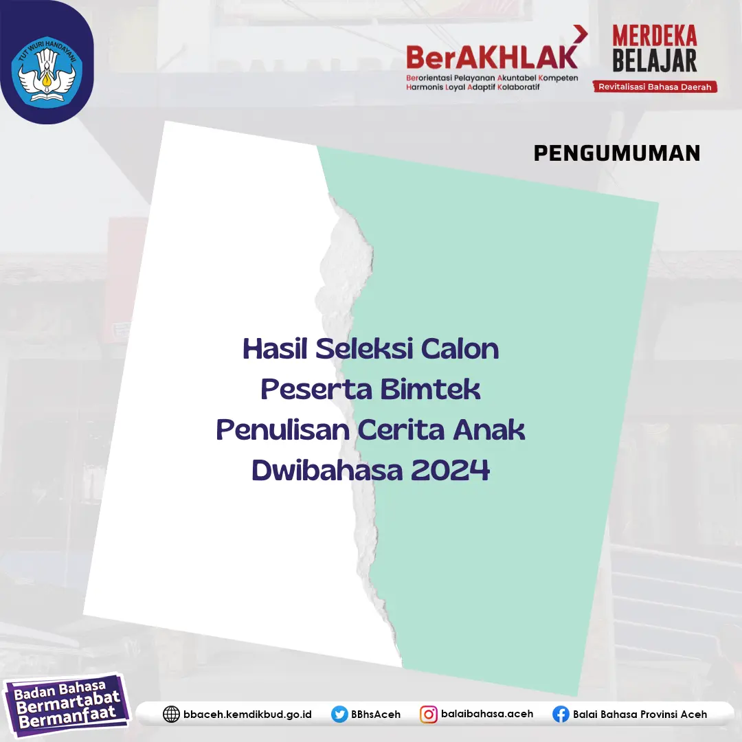 HASIL SELEKSI PORTOFOLIO PESERTA BIMBINGAN TEKNIS PENULISAN CERITA ANAK DWIBAHASA TAHUN 2024by redaksi-bbain Artikel, Pengumumanon Posted on 20/10/202420/10/2024 Assalamualaikum, Rakan! Berikut kami sampaikan Pengumuman Hasil Seleksi Calon Peserta Bimtek Penulisan Cerita Anak Dwibahasa Tahun 2024. Terima kasih kepada seluruh Rakan yang sudah berpartisipasi.Unduh pengumuman dan undangan resmi di bawah ini! Pengumuman Bimtek Undangan Jadwal SPPD Related