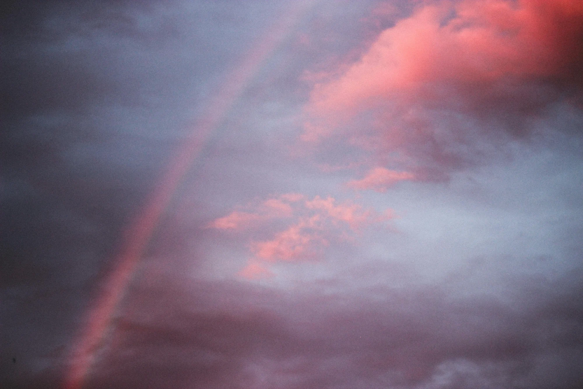 Di antara warna orange dan unggu senja, melengkung sebuah pelangi. Warnanya samar – samar, tapi bisa membuat mata siapapun terpukau dengan keindahannya.