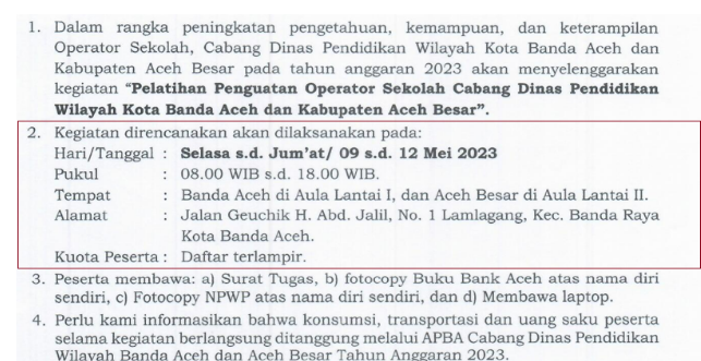 2. Kegiatan direncanakan akan dilaksanakan pada hari Selasa s.d. Jumat, tanggal 9 s.d. 12 Mei 2023, pukul 08.00 s.d. 18.00 WIB, tempat di Aula Lantai I (peserta dari Banda Aceh) dan di Aula Lantai II (peserta dari Aceh Besar), alamat di Jalan Geuchik H. Abd. Jalil, No. 1 Lamlagang, Kec. Banda Raya, Kota Banda Aceh, dan kuota peserta daftar terlampir.