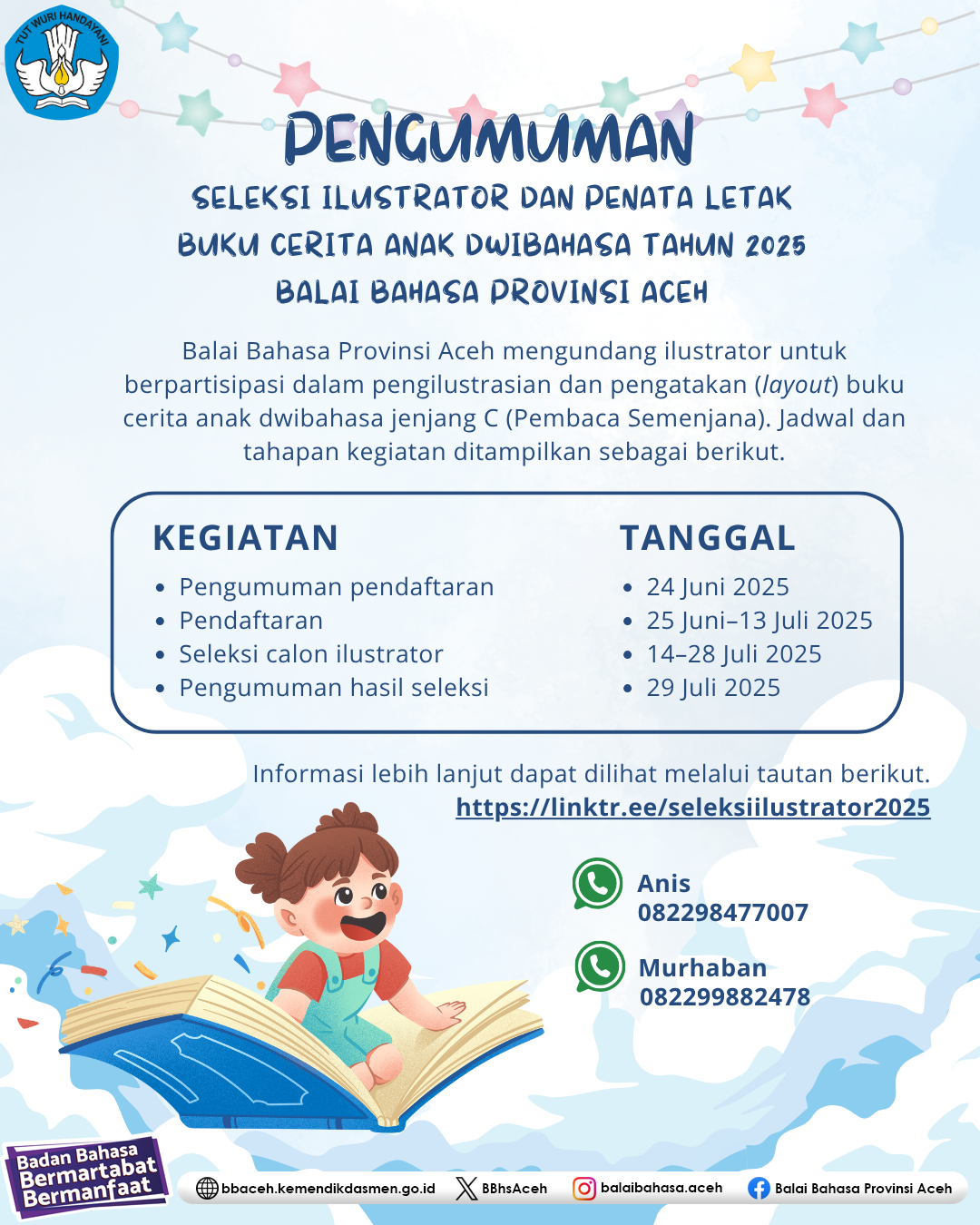 Balai Bahasa Provinsi Aceh mengundang ilustrator untuk berpartisipasi dalam Seleksi Ilustrator dan Penata Letak Buku Cerita Anak Dwibahasa Tahun 2025. Informasi lebih lanjut dapat dilihat melalui tautan berikut. https://linktr.ee/seleksiilustrator2025