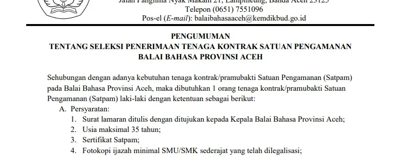 Pengumuman Seleksi Penerimaan Tenaga Kontrak Satuan Pengamanan Balai Bahasa Provinsi Aceh